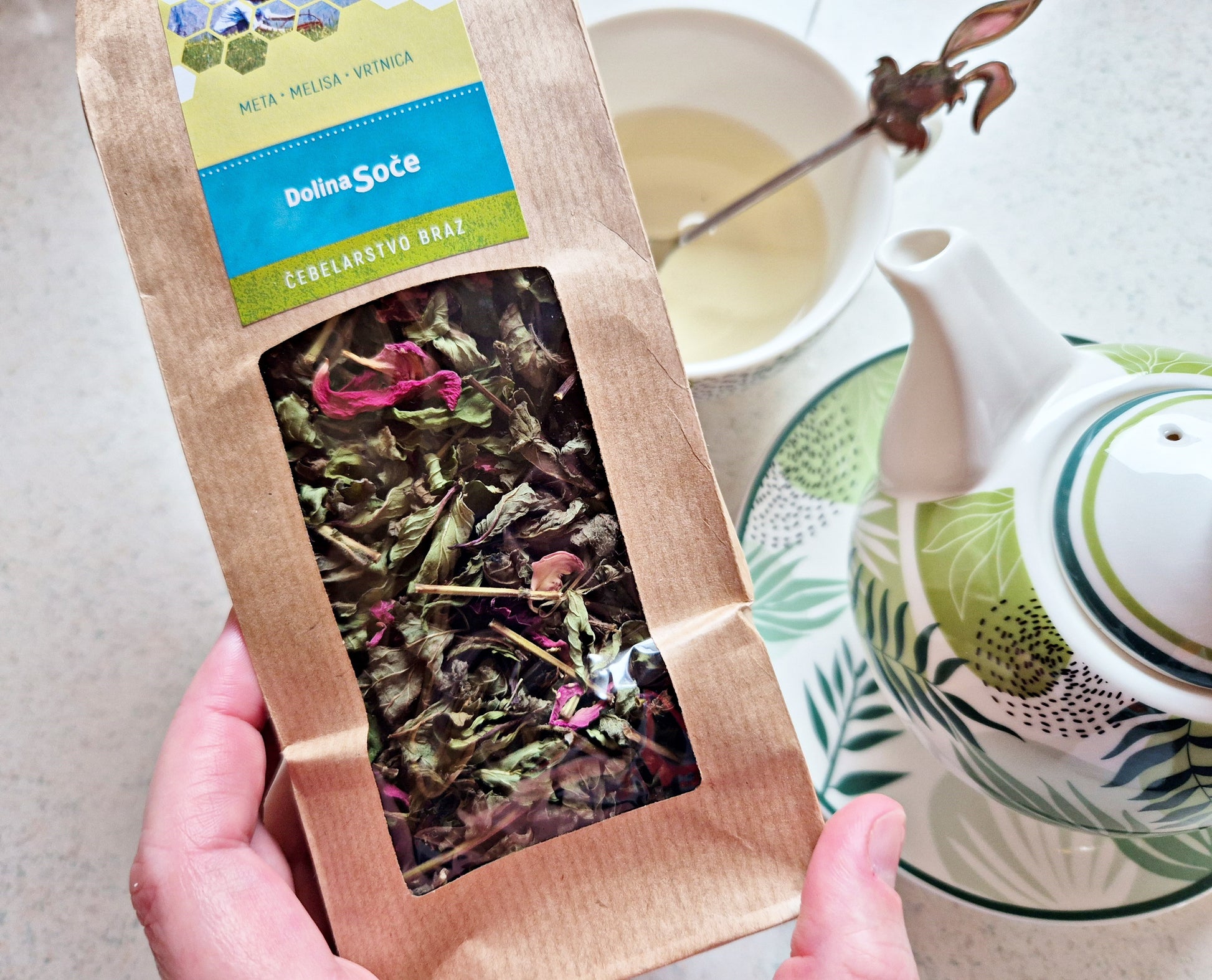 Lokalno podjetje iz Posočja, čebelarstvo Braz. Čaj meta-melisa-vrtnica mešanica 300 g.